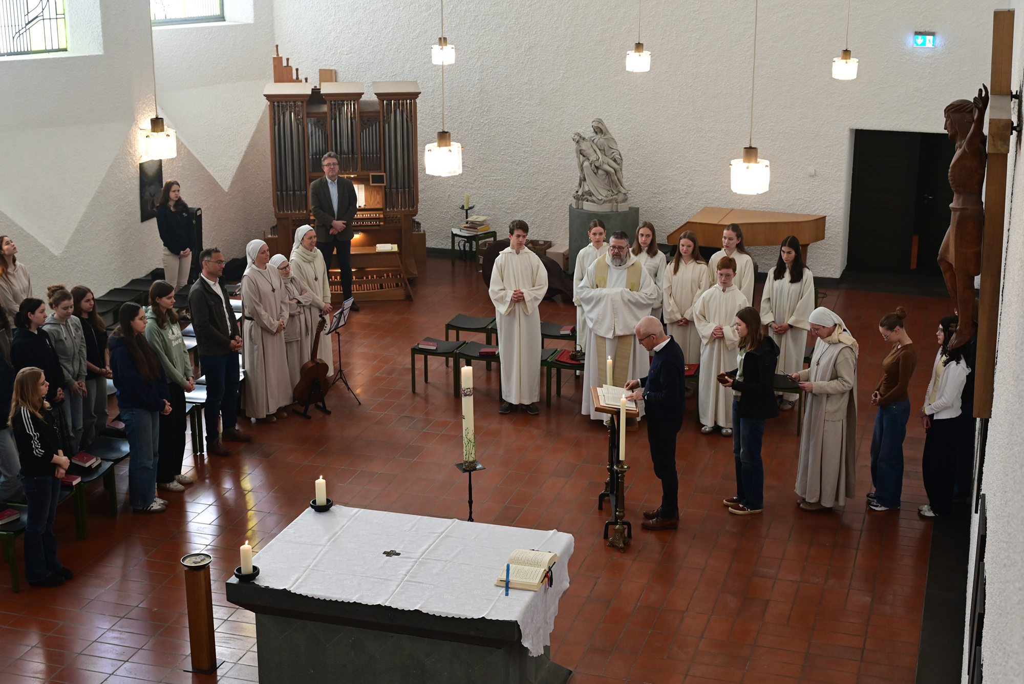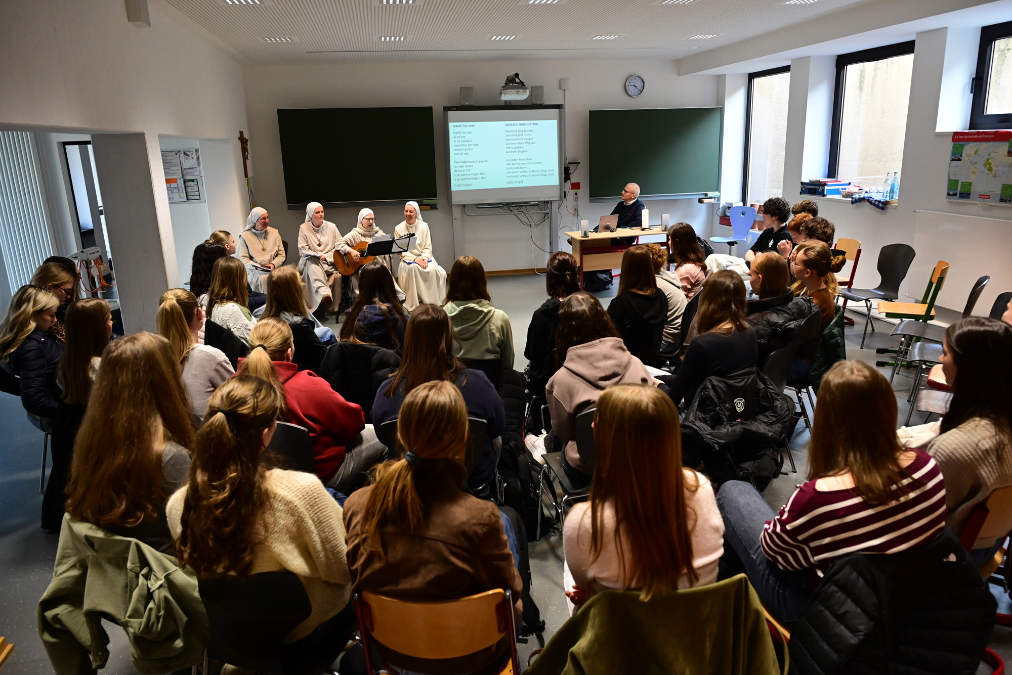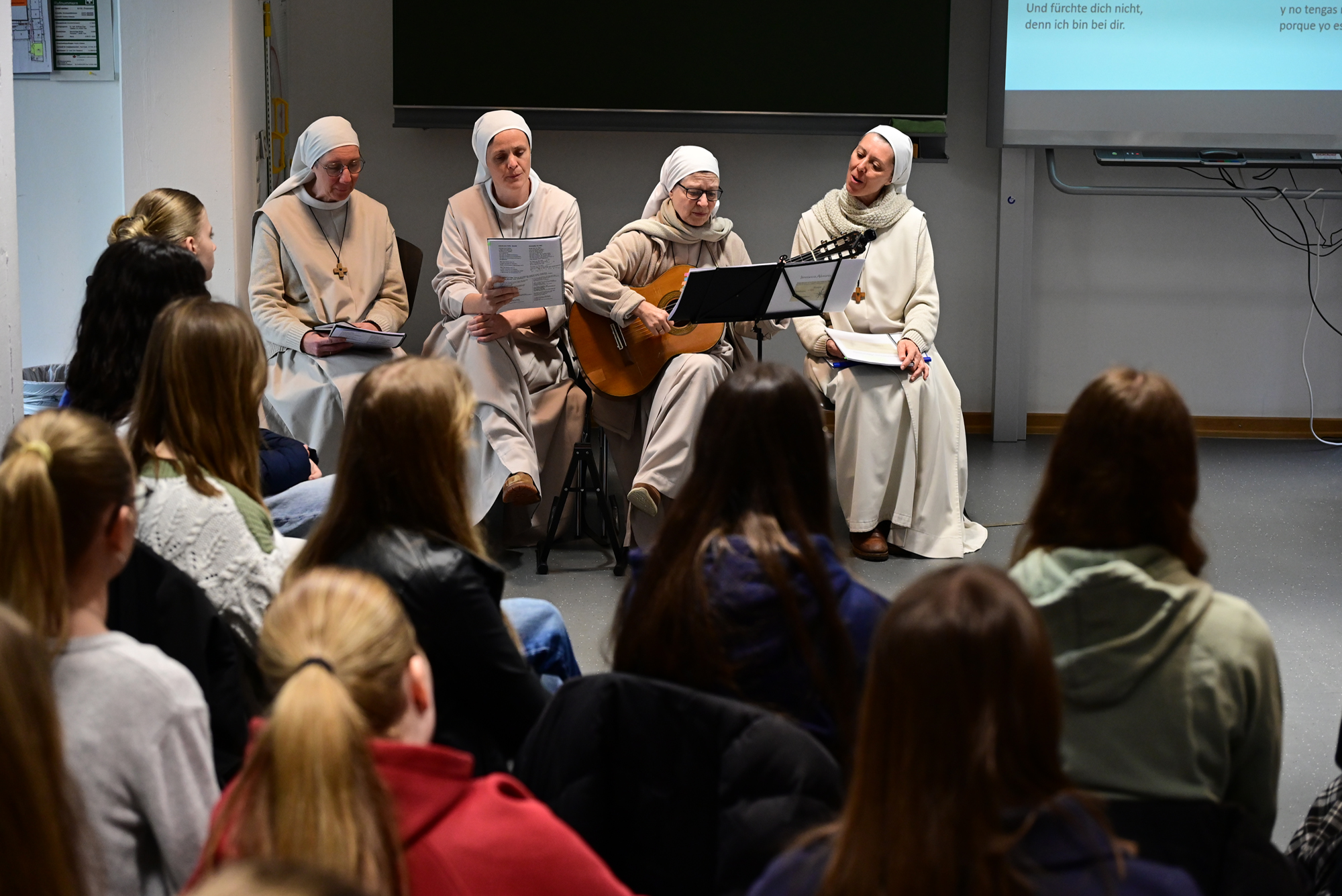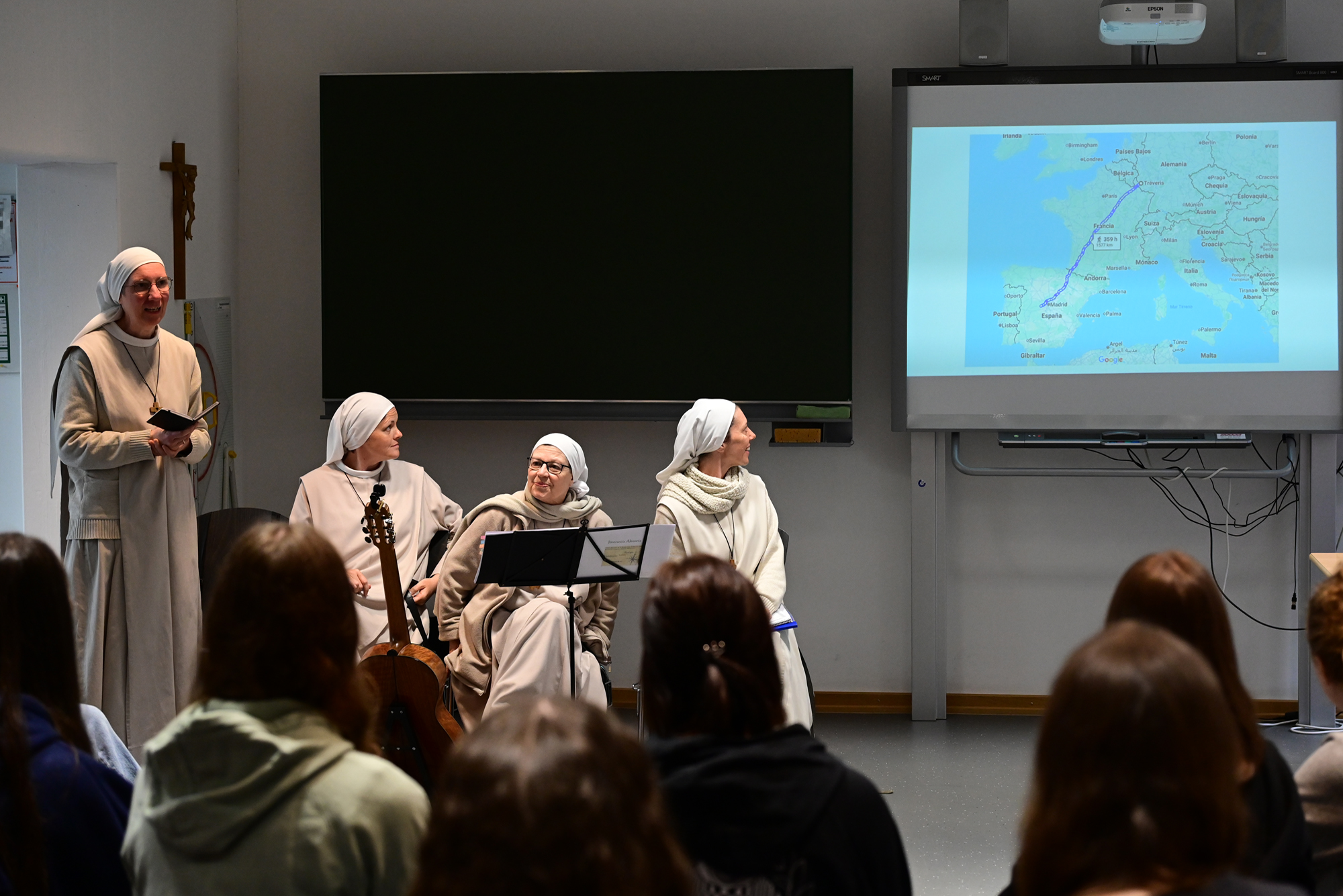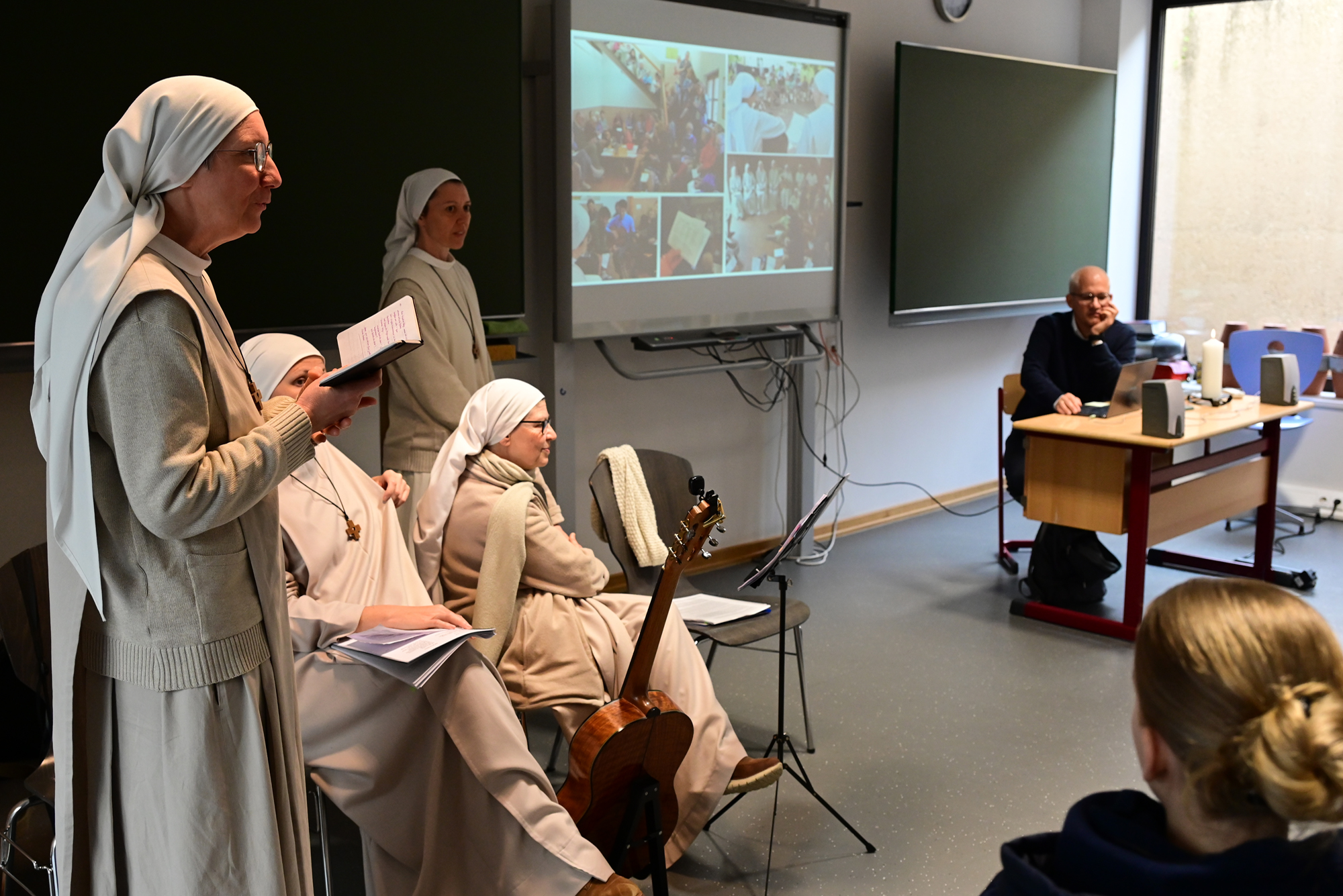 Nach einer gemeinsamen Messfeier zu Beginn des Tages in der Schulkapelle konnten Schülerinnen und Schüler der Jahrgangsstufen 10, 11 und 12 den Schwestern persönlich begegnen. Dabei erfuhren sie etwas über die Entstehung der noch recht jungen Gemeinschaft wie auch über die persönlichen Berufungserlebnisse. Auch waren sie eingeladen, sich auf eine spirituelle Reise zu begeben und den Pilgersegen zu empfangen.