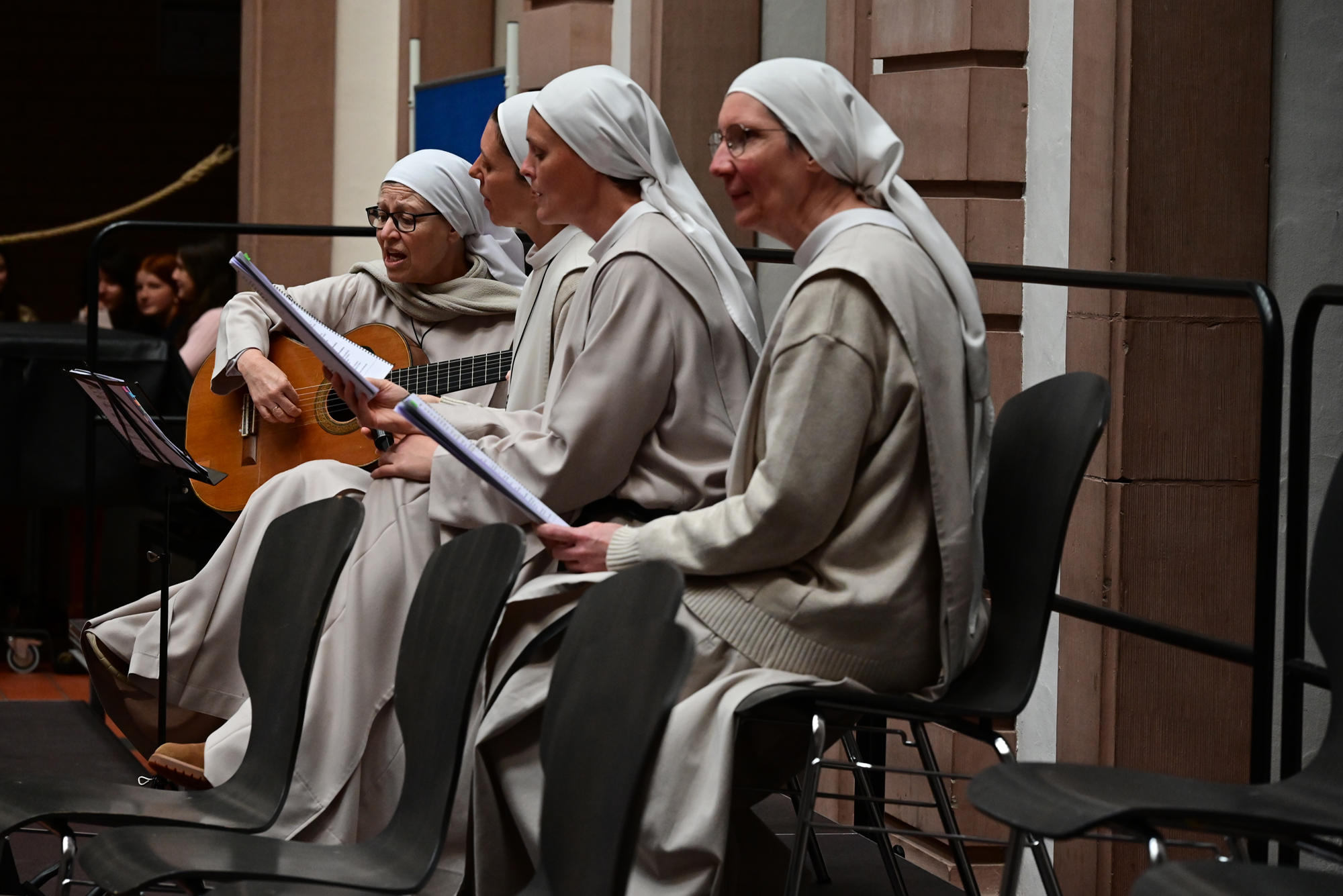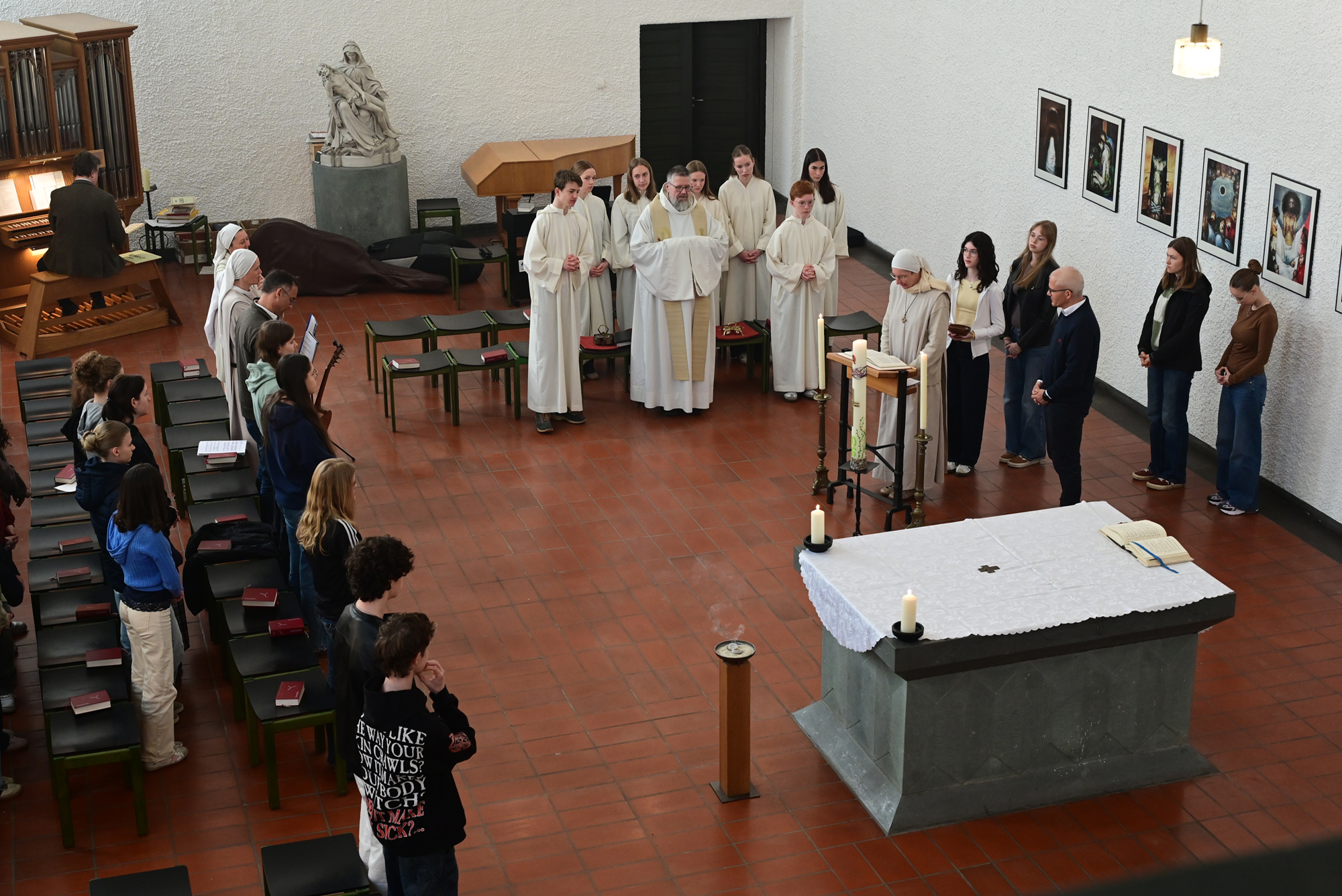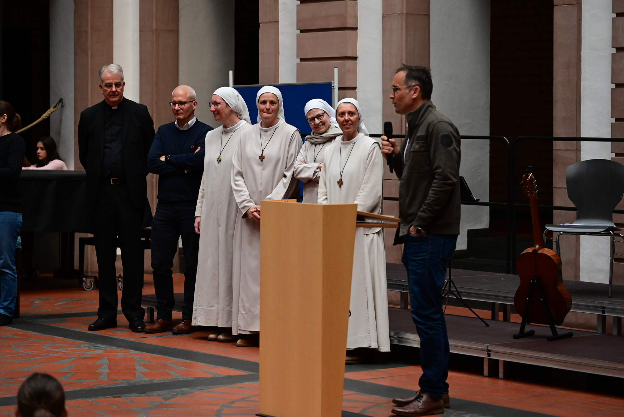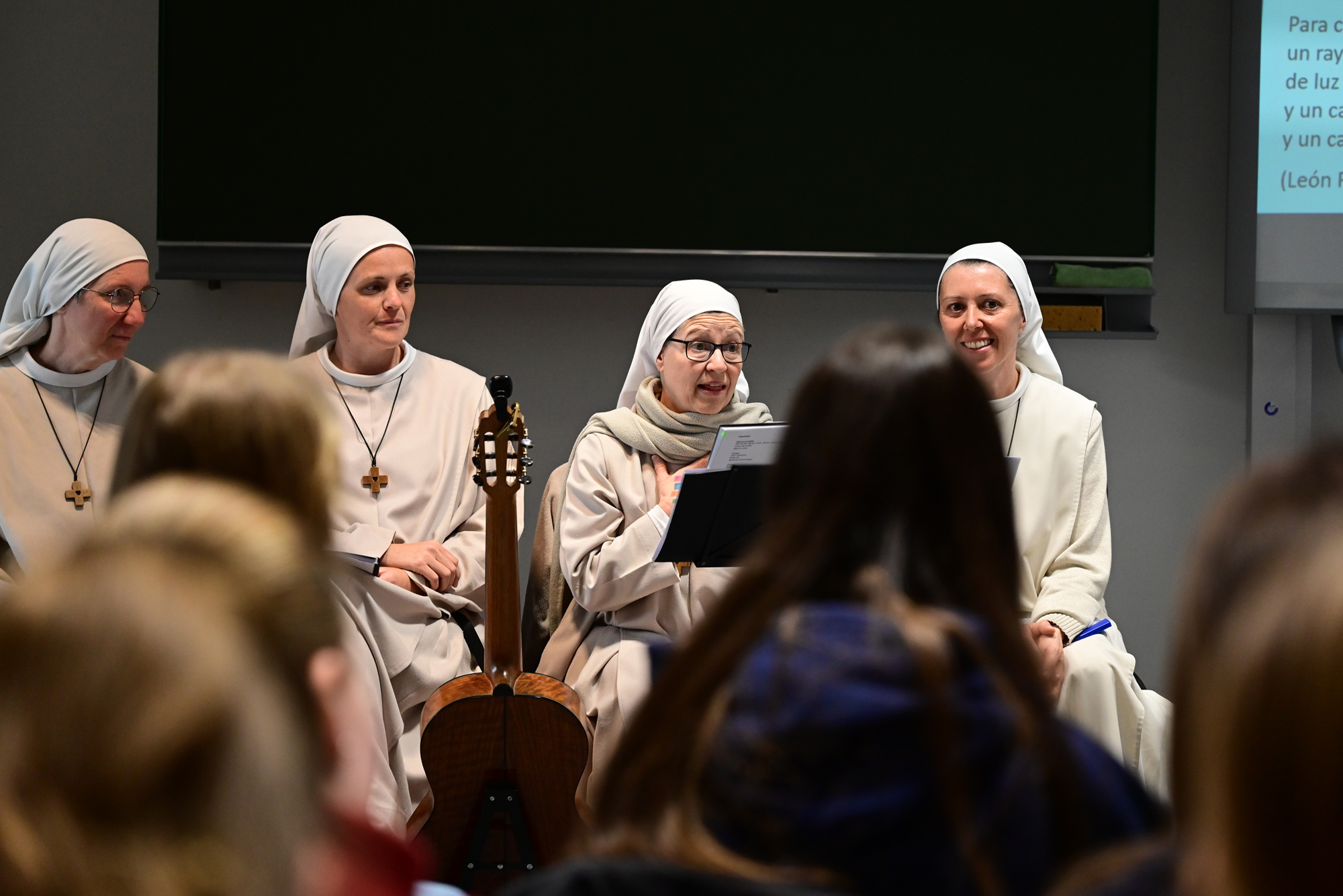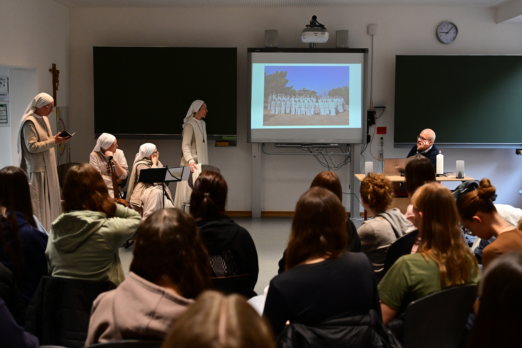 Nach einer gemeinsamen Messfeier zu Beginn des Tages in der Schulkapelle konnten Schülerinnen und Schüler der Jahrgangsstufen 10, 11 und 12 den Schwestern persönlich begegnen. Dabei erfuhren sie etwas über die Entstehung der noch recht jungen Gemeinschaft wie auch über die persönlichen Berufungserlebnisse. Auch waren sie eingeladen, sich auf eine spirituelle Reise zu begeben und den Pilgersegen zu empfangen.
